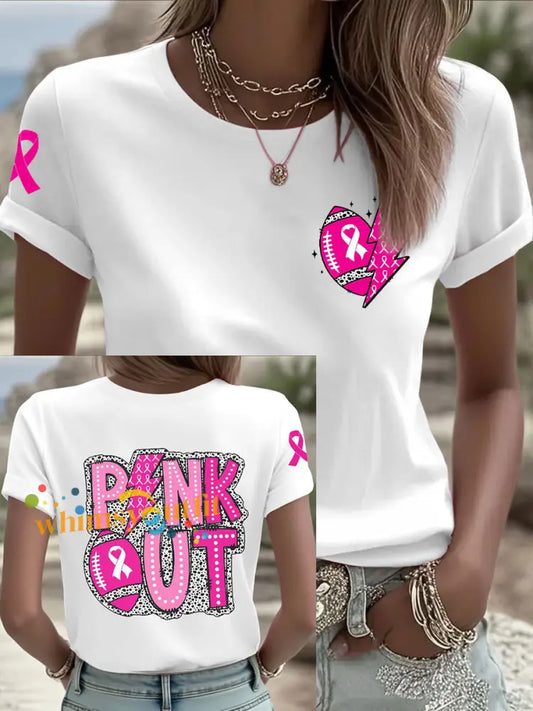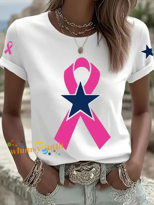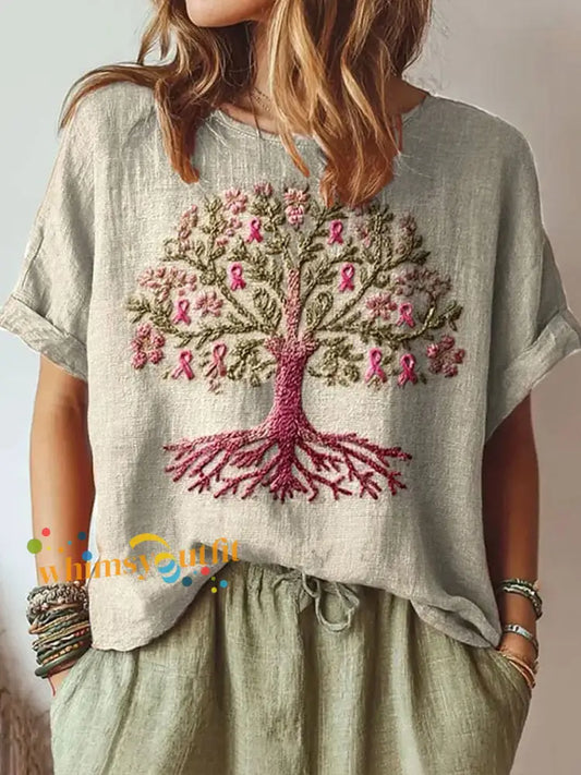 Retro Breast Cancer Embroidered Floral Jewelry with Pearls Print Comfortable Casual Cotton Short-sleeved T-shirt