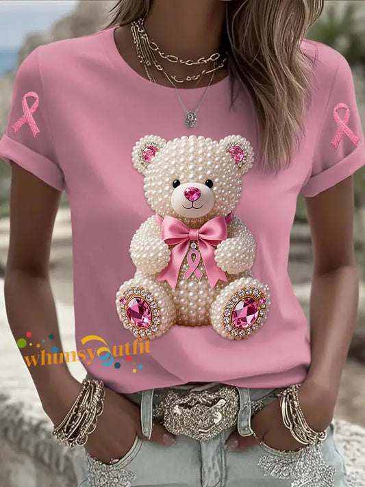 Retro Breast Cancer Pearl Diamond Multicolor Hummingbird Abstract Print Casual Cotton Waffle Long Sleeve T-Shirt