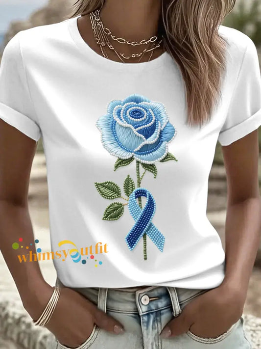 Women's Blue Rose Beaded Embroidered T-Shirt